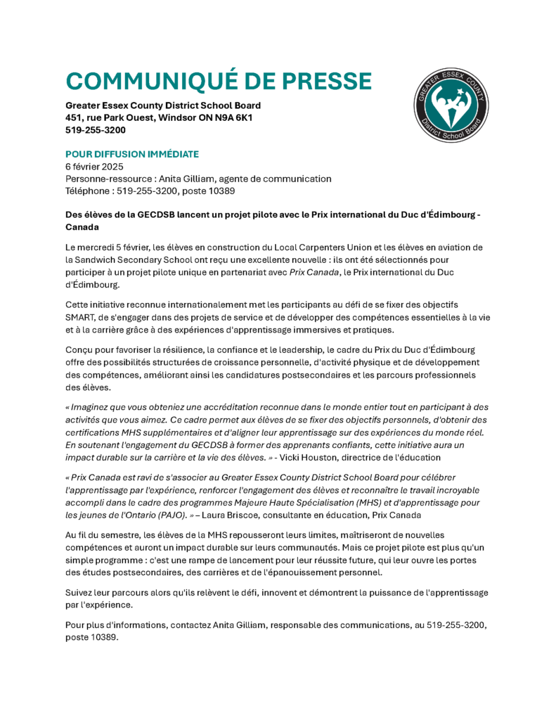 Des nouvelles passionnantes ! Nous sommes fiers d’annoncer que le Conseil scolaire du Grand Essex County (GECDSB), en Ontario, est officiellement devenu un partenaire d’exploitation du Prix Canada !